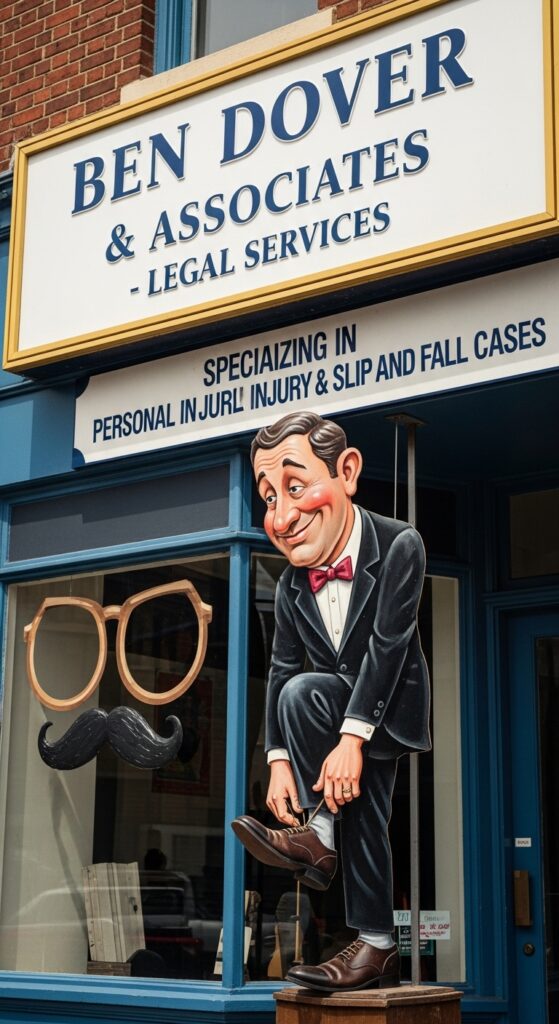 - Uses puns or homophones that sound like phrases (e.g., Ben Dover → “bend over”)